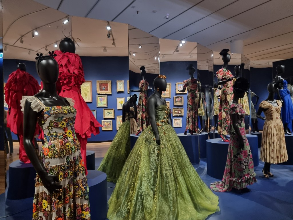 But when looking at art, one needs to keep an open mind. Aside from the haphazard salon hang, the exhibition is rather aesthetically pleasing, at least in a blockbuster way. Directly facing the salon hang is a long series of connected wavy mirrors which create distorted reflections, much like a fun house at a carnival. A group of mannequins stand in front of these mirrors, all in elegant dresses with floral patterns and motifs. Even the headwear and accessories of the mannequins are flower-related, tying in well with the theme. Yet, while this was all very nice to look at, positioned right near the salon hang made little sense, and with the singular mannequin near the entrance, even less so. This display technique is reminiscent to the group of mannequins showcasing Kusama’s designs at NGV’s past Yayoi Kusama exhibition. While this no doubt brought in much attention from audience members, it makes little sense considering the wunderkammer theme of the exhibition. Is Floribunda supposed to be loosely based on an eccentric aristocrat’s collection of flower-based objects, or is this meant to be one of NGV’s famous blockbusters, albeit in the southeastern suburbs?
